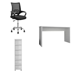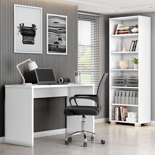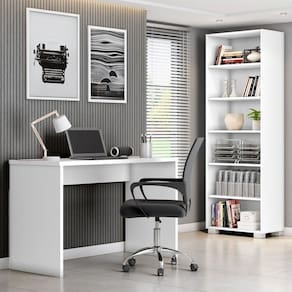 O Conjunto é composto por uma cadeira, uma escrivaninha e uma Estante para Livros feitos com MDP para dar aquele ar de robustez e beleza. É a combinação perfeita e versátil para seu home office, combinando também com vários ambientes, desde um simples local para estudos até um escritório. A Mesa para Escritório possui design simples e elegante; O livreiro é ideal para guardar e ajudar a organizar os seus livros com 5 prateleiras (sendo 3 removíveis), tudo para deixar o seu ambiente harmonizado. As peças possuem as seguintes medidas: Escrivaninha Multiuso 16443.135: 75x127x53cm (AxLxP) Estante 16449.135: 189x63x39cm (AxLxP) Acabamento: Pintura UV Altura do Conjunto: 188 cm Ambiente: null Ambiente Principal: Escritório Cor: Branco/Preto Informação Complementar: 1x Escrivaninha Gávea Office 127cm Branco White Largura: 127 Largura: 127 cm Altura: 75 Altura: 75 cm Peso: 25 kg Profundidade: 53 cm Profundidade: 53 cm Necessita Montagem: Sim Necessita Montagem: Sim