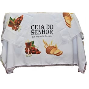 01 - toalha para mesa - medida: 1,5 x 1,5mt 01 - toalha para a bandeja de pão - medida: 40 x 50 cm 01 - toalha para a bandeja de cálices - medida: 40 x 50cm