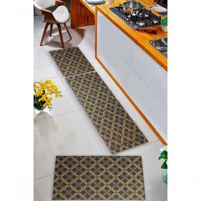Composição do Kit:- 1 Passadeira de 0,50 x 1,50 m perfeita para frente da pia ou bancadas maiores- 2 Tapetes de 0,50 x 0,75 m ideais para frente do fogão e da geladeiraAs três peças combinam entre si, formando um conjunto harmonioso que protege o piso e valoriza a decoração do ambiente.
