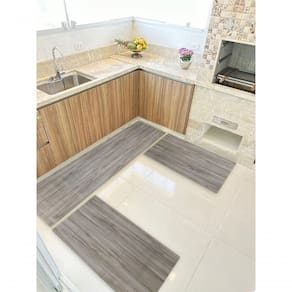 Composição do Kit:- 1 Passadeira em Manta Vinílica de 0,50x1,50 ideal para frente da pia ou balcão- 2 Tapetes Menores de 0,50x0,75 cada perfeitos para frente do fogão e da geladeiraAs três peças formam um conjunto harmônico que protege o piso e melhora o visual da sua cozinha sem sobrecarregar o ambiente.