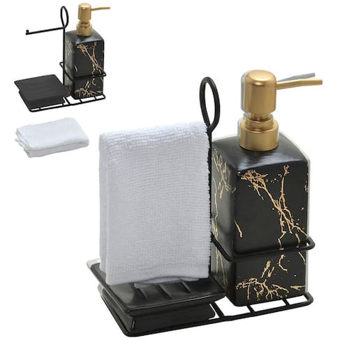 Cód: 12061 Kit 3 Peças para Banheiro de Cerâmica Preto com Toalha Material: Cerâmica, Plástico, Poliéster e Metal Cor: Preto Contém: 1 Porta Sabonete Liquido - 18x7cm (AxL) 1 Saboneteira - 9x9x2,5cm (CxLxA) 1 Suporte de Metal - 16,5x8x19cm (CxLxA) 1 Toalha - 24x23cm (CxL)