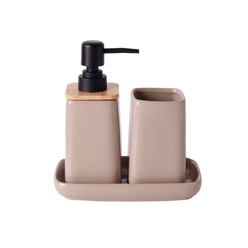 Cód: CQ0010 Kit 03 Peças para Banheiro em Cerâmica Bege Detalhe em Madeira Material: Cerâmica e Madeira Cor: Bege Contém: 1 Porta Sabonete Liquido: 17x7cm (AxL) 1 Porta Escova de Dentes: 11x7cm (AxL) 1 Bandeja: 17,5x9,5x2,5cm (CxLxA)