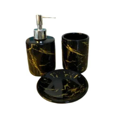 Caracteristicas: - Cor: Preto e Branco - Marca: Clink - Composição Do Produto: Cerâmica e Plastico - Contêm: 1 kit com 3 peças - Medida do Porta Sabonete: 17cm (altura) x 8,5cm (Diametro) - Medidas do Prato: 3cm (altura) x 11,5cm (diametro) - Medida do copo: 10,5cm (altura) x 7,5cm (diametro)
