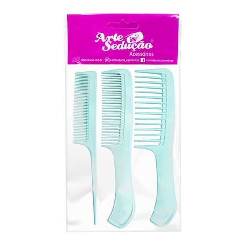 Os pentes de plástico possuem diversos usos e são indicados para pentear e desembaraçar cabelos molhados por serem resistentes, de fácil secagem e evitarem a proliferação de bactérias. São inclusos 3 pentes de diferentes tamanhos e espaçamento entre os dentes, sendo eles pequeno, médio e grande. Os pentes com pouco espaço entre os dentes são indicados para cabelos lisos devido a maior proximidade com os fios que faz com que eles sejam esticados. Já os de maior espaçamento, são indicados para cabelos ondulados os deixando com movimento e aparência natural e para cacheados e crespos facilitando o desembaraçar sem danificar os cachos.