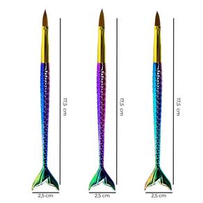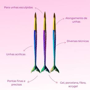 O Kit Pincéis Sereia para Alongamento de Unhas, foi projetado com materiais de alta qualidade, cerdas resistentes e precisas. Desenvolvidos para aplicação de material nas unhas, eles tem a ponta com formato fino na extremidade. Eles proporcionam precisão e controle durante a aplicação dos materiais, garantindo um acabamento . Unhas de Gel - Permitem distribuir e modelar o gel com precisão, ajudando a criar um formato uniforme e suave. Unhas de Fibra de Vidro - Facilitam a aplicação do gel sobre a fibra, garantindo que ela fique bem encapsulada e nivelada. Unhas de Porcelana Acrílico - Ajudam a moldar a mistura de pó acrílico e monômero, garantindo uma estrutura forte e natural. Unhas de Acrygel - Combinam a precisão necessária para modelar o produto, ajudando a nivelar e suavizar a superfície da unha. Acabamento e Detalhes - Ideais para esculpir pontos delicados, criar curvas perfeitas e definir áreas de alongamento. Seu maior diferencial são seus cabos, que além de um design lindo, possui relevo nas escamas oque não permite que escorreguem das mãos e sejam confortáveis de segurar por muito tempo.