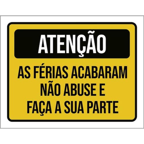 Kit 3 Placas Atenção As Férias Acabaram Não Abuse Faça 36x46 Placas de sinalizaço fabricadas com poliestireno de alto impacto PSAI de 2mm e impressão ultravioleta.