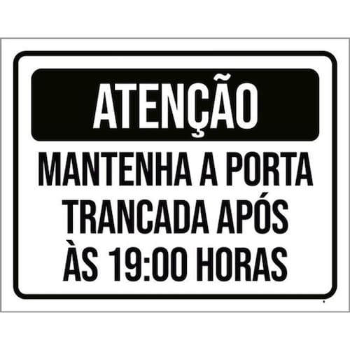 Kit 3 Placas Atenção Mantenha Porta Trancada Após 19h 36x46 Placas de sinalizaço fabricadas com poliestireno de alto impacto PSAI de 2mm e impressão ultravioleta.