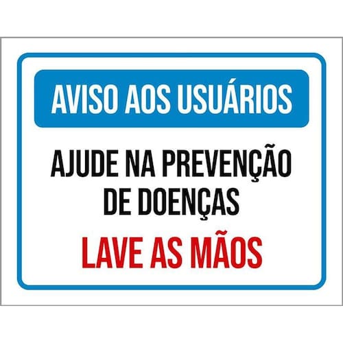 Kit 3 Placas Aviso Aos Usuários Ajude Prevenção Lave Mãos Placas de sinalizaço fabricadas com poliestireno de alto impacto PSAI de 2mm e impressão ultravioleta.
