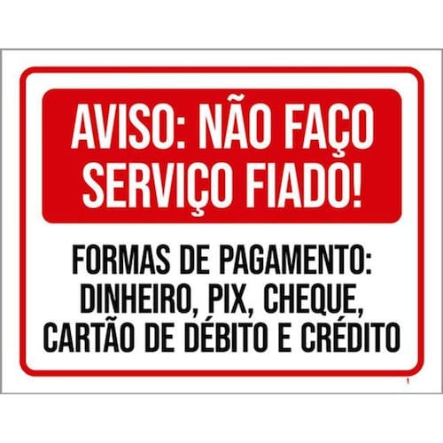 Kit 3 Placas Aviso Não Faço Serviço Fiado Formas Pagamento Placas de sinalizaço fabricadas com poliestireno de alto impacto PSAI de 2mm e impressão ultravioleta.