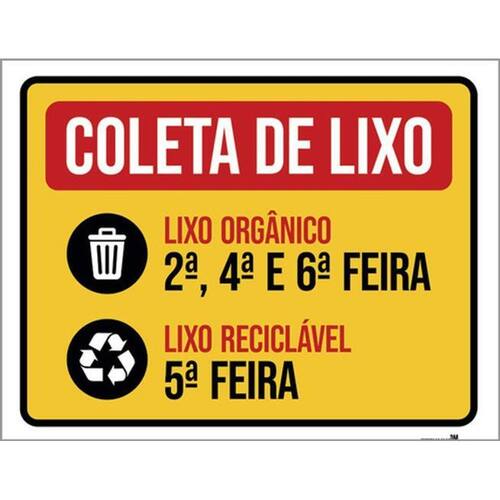Kit 3 Placas Coleta Lixo Orgânico E Reciclável Dias 36x46 Placas de sinalizaço fabricadas com poliestireno de alto impacto PSAI de 2mm e impressão ultravioleta.