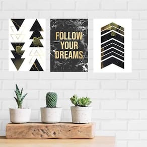 Kit 3 placas decorativas follow your dreams 18x27cm Informações do produto tire todas as suas dúvidas no descritivo abaixo: placas decorativas são tendência e uma excelente ideia para decorar ambientes de forma econômica e bonita, elas são leves e extremamente fáceis de instalar; além de servir para a decoração de qualquer ambiente, indo desde estabelecimentos como barbearias e bares, até quartos, sala, área de lazer, churrasqueira, etc. Ou ainda, e por que não, poder quebrar aquele galho tampando imperfeições indesejadas da parede com um toque especial medidas - cada peça tem 18x27cm. Material do papel - papel fotográfico brilhante de altíssima resolução garantia - garantia de 3 meses.
