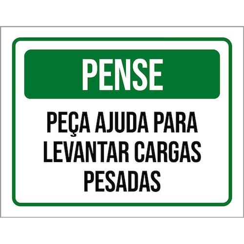 Kit 3 Placas Pense Peça Ajuda Levantar Cargas Pesadas Placas de sinalizaço fabricadas com poliestireno de alto impacto PSAI de 2mm e impressão ultravioleta.