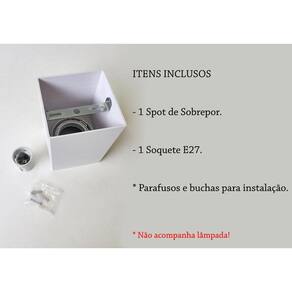 Os spots de sobrepor são luminárias modernas e que proporcionam um lindo acabamento, mais sofisticado. São capazes de prover uma iluminação eficiente e diferenciada. Os spot de sobrepor Par20 tem o acabamento impecável, possuem recuo na lâmpada proporcionando maior conforto visual, são direcionáveis e de fácil instalação e manutenção. São perfeitos para deixar o seu ambiente mais bonito e confortável. Possui sistema click, no qual não é necessário retirar o spot para troca de lâmpada.-- Neste kit contém 3 spots -- Descrição:- Material: ABS - Cor: Branco- Dimensões: Largura: 11 cm Altura: 15 cm- Tipo de lâmpada: Par20- Potência máxima: 40W- Tensão: 100V - 240V- Grau de Proteção: IP20- Frequência: 50/60HZITENS INCLUSOS- 1 Spot de Sobrepor.- 1 Soquete E27.Parafusos e buchas para instalação.- Possuem foco Direcionável - Fácil Limpeza pano seco sem produtos abrasivos - Possui sistema click, no qual não é necessário retirar o spot para troca de lâmpada. - Uso externo / interno - NÃO Acompanha Lâmpada -