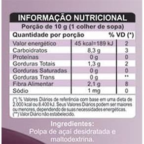Ingredientes: Polpa de açaí desidratada, maltodextrina