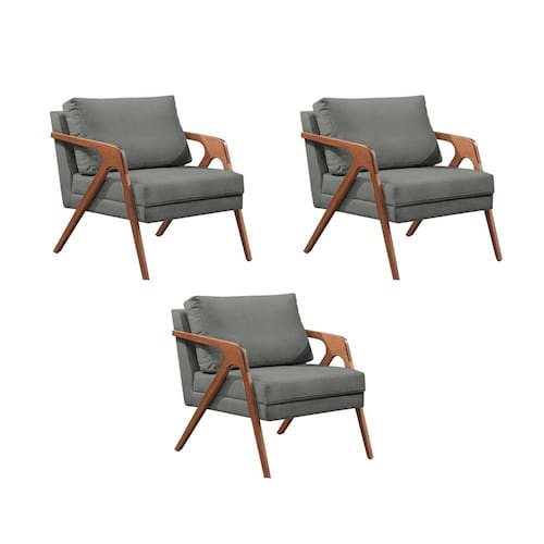 Kit 3 Poltronas Decorativas Mona Premium Base Madeira Maciça Linho Cinza