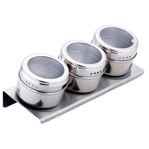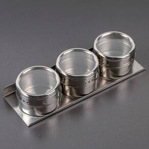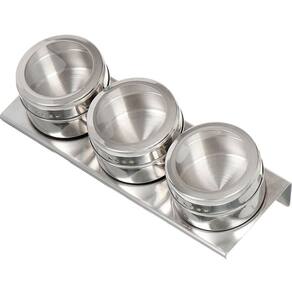 ESPECIFICAÇÕES: Material: Aço Inoxidável Comprimento da Base: 21cm Largura da Base: 7,5cm Diâmetro dos Frascos: 6,5cm Altura dos Frasco: 4,5cm Peso individual dos Frascos: 58g Peso da Base: 96g Peso Total: 274g Cor: Cinza Metálico