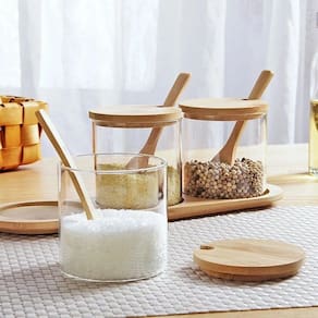 Suporte: o suporte de bambu acomoda os 3 potes, um ao lado do outro, facilitando a organização.