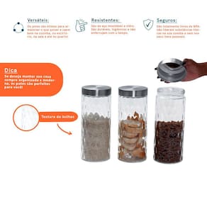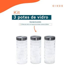 O kit contém: 3 potes bolhas 2200ml de vidro com tampa inox redondo Comprimento: 11cm Largura: 27cm Altura: 11cm