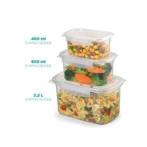 Características Principais: Material Resistente: Fabricados em plástico de alta qualidade, os potes são duráveis, leves e livres de BPA, garantindo segurança para o armazenamento de alimentos. Sistema de Trava: As tampas possuem travas laterais firmes que evitam vazamentos e mantêm o frescor dos alimentos por mais tempo. Versatilidade de Tamanhos: O kit inclui potes nos tamanhos pequeno, médio e grande, ideais para organizar desde lanches e grãos até refeições completas. Design Empilhável: Economize espaço na geladeira ou no armário com potes que podem ser empilhados de forma prática e organizada. Fácil Limpeza: Podem ser lavados manualmente ou na lava-louças, tornando sua rotina mais prática. Dimensões Aproximadas: Pequeno: 460ml Médio: 850ml Grande: 2,2L