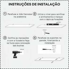 - Instruções de Montagem: Posicione O Produto na Parede, e Marque Com um Lápis o Local Onde Estão os Furos Das Prateleiras. Com Uma Furadeira, Faça os Furos Nos Locais Marcados e Insira a Bucha e Suporte de Embutir Que Acompanham O Produto Então Encaixe a Prateleira ou Nicho.