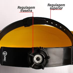 Protetor facial com ajuste de cabeça com catraca, material muito confortável. Proteção contra pequenos estilhaços de pedras, madeiras ou pequenos pedaços de objetos que são lançados contra o rosto ao manusear um equipamento de corte.