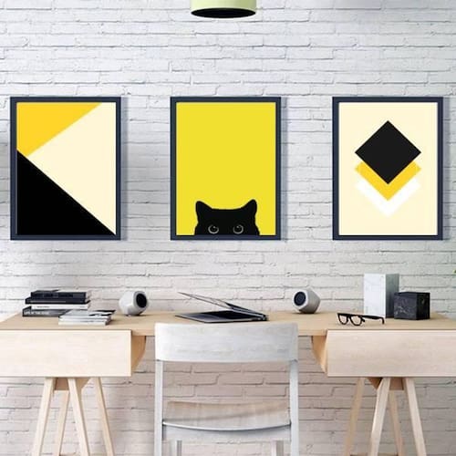 Kit 3 quadros geométricos gato preto/amarelo 45x34cm - com vidro Moldura: madeira preta Informações do produto Decoração para quarto, sala, cozinha, escritório, área gourmet e muito mais. Chega de paredes vazias: medidas - cada peça tem 45x34cm a3 . Material do papel - papel fotográfico brilhante de altíssima resolução acabamento - todos os quadros são acompanhados de vidro para proteção da imagem. - moldura em madeira maciça na cor preta e pendurador. - os quadros são embalados de forma segura com plástico bolha com camada dupla de acordo com o tamanho dos quadros. - de 3 meses. Meu quadro chegou. Como posso fixá-lo Você precisa apenas de um martelo e um prego, pois os quadros já vão acompanhados de penduradores. Esta é a forma mais indicada. Como posso limpar meu quadro A limpeza é feita como um móvel comum da sua casa. Apenas um pano seco ou espanador são suficientes para tal