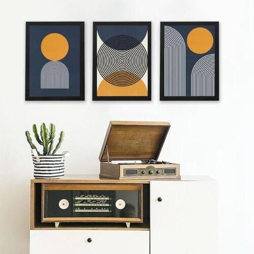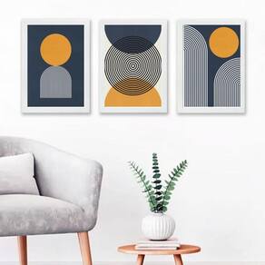 Kit 3 quadros abstratos azul e mostarda- círculos 33x24cm - com vidro Moldura: madeira preta Informações do produto tire todas as suas dúvidas no descritivo abaixo: decoração para quarto, sala, cozinha, escritório, área gourmet e muito mais. Chega de paredes vazias medidas - cada peça tem 33x24cm a4 . Material do papel - papel fotográfico brilhante de altíssima resolução acabamento - todos os quadros são acompanhados de vidro para proteção da imagem. - moldura em madeira maciça na cor preta ou branca conforme produto escolhido e pendurador . - os quadros são embalados de forma segura com plástico bolha com camada dupla de acordo com o tamanho dos quadros. Garantia - garantia de 3 meses. Meu quadro chegou. Como posso fixá-lo Você precisa apenas de um martelo e um prego, pois os quadros já vão acompanhados de penduradores. Esta é a forma mais indicada. Como posso limpar meu quadro A limpeza é feita como um móvel comum da sua casa. Apenas um pano seco ou espanador são suficientes para tal Ean: 7899136608319
