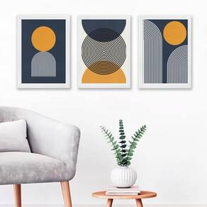 Kit 3 quadros abstratos azul e mostarda- círculos 33x24cm Moldura: madeira branca Informações do produto tire todas as suas dúvidas no descritivo abaixo: decoração para quarto, sala, cozinha, escritório, área gourmet e muito mais. Chega de paredes vazias medidas - cada peça tem 33x24cm a4 . Material do papel - papel fotográfico brilhante de altíssima resolução acabamento - todos os quadros são acompanhados de uma película de acetato para proteção da imagem. - os quadros são embalados de forma segura com plástico bolha com camada dupla de acordo com o tamanho dos quadros. Garantia - garantia de 3 meses. Meu quadro chegou. Como posso fixá-lo Você precisa apenas de um martelo e um prego, pois os quadros já vão acompanhados de penduradores. Esta é a forma mais indicada. Caso prefira, você pode utilizar uma fita dupla face neste caso, sugerimos de alta qualidade para evitar que descole e seu quadro caia . Como posso limpar meu quadro A limpeza é feita como um móvel comum da sua casa. Apenas um pano seco ou espanador são suficientes para tal