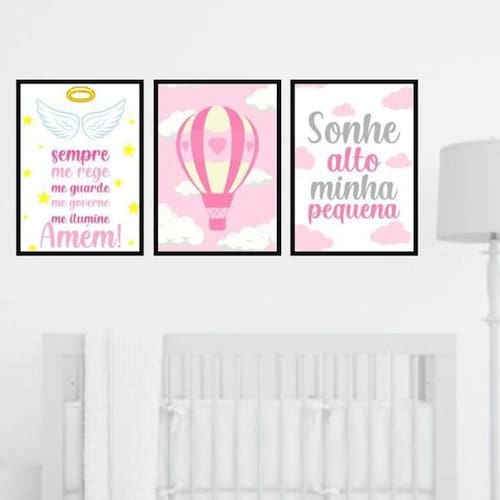 Kit 3 quadros anjo da guarda - sonhe alto 33x24cm - com vidro Moldura: madeira preta Informações do produto tire todas as suas dúvidas no descritivo abaixo: decoração para quarto, sala, cozinha, escritório, área gourmet e muito mais. Chega de paredes vazias medidas - cada peça tem 33x24cm a4 . Material do papel - papel fotográfico brilhante de altíssima resolução acabamento - todos os quadros são acompanhados de vidro para proteção da imagem. - moldura em madeira maciça na cor preta e pendurador . - os quadros são embalados de forma segura com plástico bolha com camada dupla de acordo com o tamanho dos quadros. Garantia - garantia de 3 meses. Meu quadro chegou. Como posso fixá-lo Você precisa apenas de um martelo e um prego, pois os quadros já vão acompanhados de penduradores. Esta é a forma mais indicada. Como posso limpar meu quadro A limpeza é feita como um móvel comum da sua casa. Apenas um pano seco ou espanador são suficientes para tal