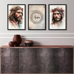 Kit 3 quadros aquarelas face de jesus - pai nosso 45x34cm - com vidro Moldura: madeira preta Informações do produto tire todas as suas dúvidas no descritivo abaixo: decoração para quarto, sala, cozinha, escritório, área gourmet e muito mais. Chega de paredes vazias medidas - cada peça tem 45x34cm a3 . Material do papel - papel fotográfico brilhante de altíssima resolução acabamento - todos os quadros são acompanhados de vidro para proteção da imagem. - moldura em madeira maciça na cor preta ou branca conforme produto escolhido e pendurador . - os quadros são embalados de forma segura com plástico bolha com camada dupla de acordo com o tamanho dos quadros. Garantia - garantia de 3 meses. Meu quadro chegou. Como posso fixá-lo Você precisa apenas de um martelo e um prego, pois os quadros já vão acompanhados de penduradores. Esta é a forma mais indicada. Como posso limpar meu quadro A limpeza é feita como um móvel comum da sua casa. Apenas um pano seco ou espanador são suficientes para tal