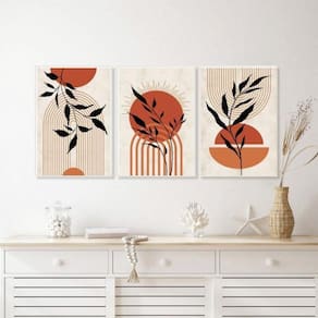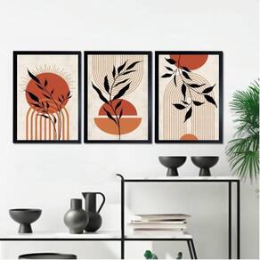 Kit 3 quadros bohos folhas e círculos terracota 33x24cm - com vidro Moldura: madeira preta Informações do produto tire todas as suas dúvidas no descritivo abaixo: decoração para quarto, sala, cozinha, escritório, área gourmet e muito mais. Chega de paredes vazias medidas - cada peça tem 33x24cm a4 . Material do papel - papel fotográfico brilhante de altíssima resolução acabamento - todos os quadros são acompanhados de vidro para proteção da imagem. - moldura em madeira maciça na cor preta e pendurador . - os quadros são embalados de forma segura com plástico bolha com camada dupla de acordo com o tamanho dos quadros. Garantia - garantia de 3 meses. Meu quadro chegou. Como posso fixá-lo Você precisa apenas de um martelo e um prego, pois os quadros já vão acompanhados de penduradores. Esta é a forma mais indicada. Como posso limpar meu quadro A limpeza é feita como um móvel comum da sua casa. Apenas um pano seco ou espanador são suficientes para tal Ean: 7898669409837