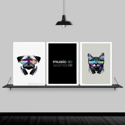 Kit 3 Quadros Cão E Gato Música 24X18Cm - Madeira Branca
