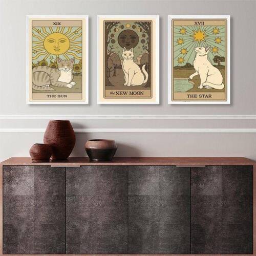Kit 3 quadros cartas tarot gatos- the sun, the moon, the star 24x18cm - com vidro Moldura: madeira branca Informações do produto tire todas as suas dúvidas no descritivo abaixo: decoração para quarto, sala, cozinha, escritório, área gourmet e muito mais. Chega de paredes vazias medidas - cada peça tem 24x18cm a5 . Material do papel - papel fotográfico brilhante de altíssima resolução acabamento - todos os quadros são acompanhados de vidro para proteção da imagem. - moldura em madeira maciça na cor preta ou branca conforme produto escolhido e pendurador . - os quadros são embalados de forma segura com plástico bolha com camada dupla de acordo com o tamanho dos quadros. Garantia - garantia de 3 meses. Meu quadro chegou. Como posso fixá-lo Você precisa apenas de um martelo e um prego, pois os quadros já vão acompanhados de penduradores. Esta é a forma mais indicada. Como posso limpar meu quadro A limpeza é feita como um móvel comum da sua casa. Apenas um pano seco ou espanador são suficientes para tal Ean: 7896539022759