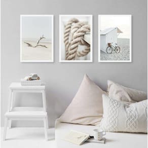 Kit 3 quadros coleção praia branco e bege 33x24cm Moldura: madeira branca Informações do produto tire todas as suas dúvidas no descritivo abaixo: decoração para quarto, sala, cozinha, escritório, área gourmet e muito mais. Chega de paredes vazias medidas - cada peça tem 33x24cm a4 . Material do papel - papel fotográfico brilhante de altíssima resolução acabamento - todos os quadros são acompanhados de uma película de acetato para proteção da imagem. - os quadros são embalados de forma segura com plástico bolha com camada dupla de acordo com o tamanho dos quadros. Garantia - garantia de 3 meses. Meu quadro chegou. Como posso fixá-lo Você precisa apenas de um martelo e um prego, pois os quadros já vão acompanhados de penduradores. Esta é a forma mais indicada. Caso prefira, você pode utilizar uma fita dupla face neste caso, sugerimos de alta qualidade para evitar que descole e seu quadro caia . Como posso limpar meu quadro A limpeza é feita como um móvel comum da sua casa. Apenas um pano seco ou espanador são suficientes para tal