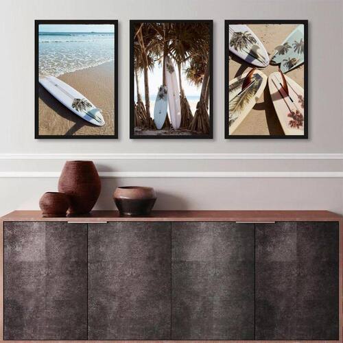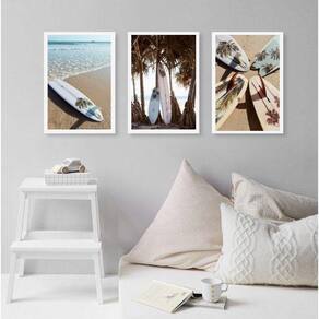Kit 3 quadros coleção praia - pranchas surf 33x24cm - com vidro Moldura: madeira branca Informações do produto tire todas as suas dúvidas no descritivo abaixo: decoração para quarto, sala, cozinha, escritório, área gourmet e muito mais. Chega de paredes vazias medidas - cada peça tem 33x24cm a4 . Material do papel - papel fotográfico brilhante de altíssima resolução acabamento - todos os quadros são acompanhados de vidro para proteção da imagem. - moldura em madeira maciça na cor preta ou branca conforme produto escolhido e pendurador . - os quadros são embalados de forma segura com plástico bolha com camada dupla de acordo com o tamanho dos quadros. Garantia - garantia de 3 meses. Meu quadro chegou. Como posso fixá-lo Você precisa apenas de um martelo e um prego, pois os quadros já vão acompanhados de penduradores. Esta é a forma mais indicada. Como posso limpar meu quadro A limpeza é feita como um móvel comum da sua casa. Apenas um pano seco ou espanador são suficientes para tal