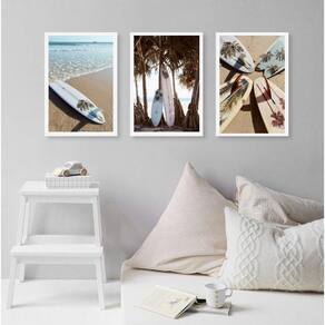 Kit 3 quadros coleção praia - pranchas surf 33x24cm - com vidro Moldura: madeira branca Informações do produto tire todas as suas dúvidas no descritivo abaixo: decoração para quarto, sala, cozinha, escritório, área gourmet e muito mais. Chega de paredes vazias medidas - cada peça tem 33x24cm a4 . Material do papel - papel fotográfico brilhante de altíssima resolução acabamento - todos os quadros são acompanhados de vidro para proteção da imagem. - moldura em madeira maciça na cor preta ou branca conforme produto escolhido e pendurador . - os quadros são embalados de forma segura com plástico bolha com camada dupla de acordo com o tamanho dos quadros. Garantia - garantia de 3 meses. Meu quadro chegou. Como posso fixá-lo Você precisa apenas de um martelo e um prego, pois os quadros já vão acompanhados de penduradores. Esta é a forma mais indicada. Como posso limpar meu quadro A limpeza é feita como um móvel comum da sua casa. Apenas um pano seco ou espanador são suficientes para tal Ean: 7898154548546