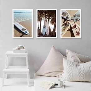 Kit 3 quadros coleção praia - pranchas surf 33x24cm Moldura: madeira branca Informações do produto tire todas as suas dúvidas no descritivo abaixo: decoração para quarto, sala, cozinha, escritório, área gourmet e muito mais. Chega de paredes vazias medidas - cada peça tem 33x24cm a4 . Material do papel - papel fotográfico brilhante de altíssima resolução acabamento - todos os quadros são acompanhados de uma película de acetato para proteção da imagem. - os quadros são embalados de forma segura com plástico bolha com camada dupla de acordo com o tamanho dos quadros. Garantia - garantia de 3 meses. Meu quadro chegou. Como posso fixá-lo Você precisa apenas de um martelo e um prego, pois os quadros já vão acompanhados de penduradores. Esta é a forma mais indicada. Caso prefira, você pode utilizar uma fita dupla face neste caso, sugerimos de alta qualidade para evitar que descole e seu quadro caia . Como posso limpar meu quadro A limpeza é feita como um móvel comum da sua casa. Apenas um pano seco ou espanador são suficientes para tal