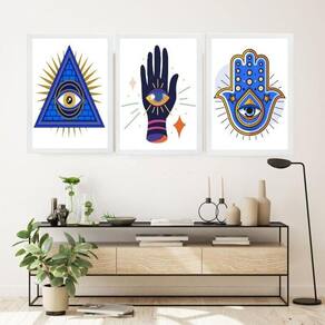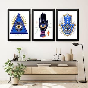 Kit 3 quadros decoração esotérica - olho grego 33x24cm - com vidro Cor: moldura preta Informações do produto tire todas as suas dúvidas no descritivo abaixo: decoração para quarto, sala, cozinha, escritório, área gourmet e muito mais. Chega de paredes vazias medidas - cada peça tem 33x24cm a4 . Material do papel - papel fotográfico brilhante de altíssima resolução acabamento - todos os quadros são acompanhados de vidro para proteção da imagem. - moldura em madeira maciça na cor preta ou branca conforme produto escolhido e pendurador . - os quadros são embalados de forma segura com plástico bolha com camada dupla de acordo com o tamanho dos quadros. Garantia - garantia de 3 meses. Meu quadro chegou. Como posso fixá-lo Você precisa apenas de um martelo e um prego, pois os quadros já vão acompanhados de penduradores. Esta é a forma mais indicada. Como posso limpar meu quadro A limpeza é feita como um móvel comum da sua casa. Apenas um pano seco ou espanador são suficientes para tal