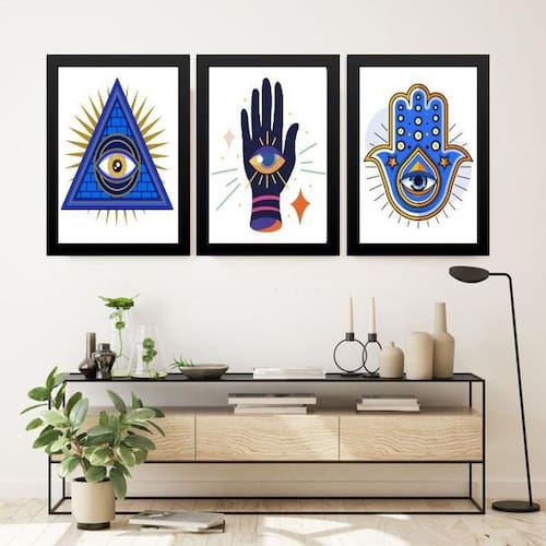 Kit 3 quadros decoração esotérica - olho grego 33x24cm Cor: moldura preta Informações do produto tire todas as suas dúvidas no descritivo abaixo: decoração para quarto, sala, cozinha, escritório, área gourmet e muito mais. Chega de paredes vazias medidas - cada peça tem 33x24cm a4 . Material do papel - papel fotográfico brilhante de altíssima resolução acabamento - todos os quadros são acompanhados de uma película de acetato para proteção da imagem. - os quadros são embalados de forma segura com plástico bolha com camada dupla de acordo com o tamanho dos quadros. Garantia - garantia de 3 meses. Meu quadro chegou. Como posso fixá-lo Você precisa apenas de um martelo e um prego, pois os quadros já vão acompanhados de penduradores. Esta é a forma mais indicada. Caso prefira, você pode utilizar uma fita dupla face neste caso, sugerimos de alta qualidade para evitar que descole e seu quadro caia . Como posso limpar meu quadro A limpeza é feita como um móvel comum da sua casa. Apenas um pano seco ou espanador são suficientes para tal Ean: 7891234534897