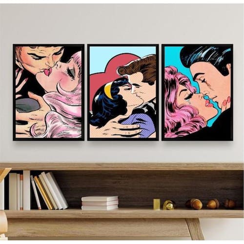 Kit 3 Quadros Decorativos Beijo Pop Art - Casais 45X34Cm