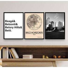 Kit 3 quadros decorativos belo horizonte-mapa cidade 24x18cm - com vidro Moldura: madeira preta Informações do produto tire todas as suas dúvidas no descritivo abaixo: decoração para quarto, sala, cozinha, escritório, área gourmet e muito mais. Chega de paredes vazias medidas - cada peça tem 24x18cm a5 . Material do papel - papel fotográfico brilhante de altíssima resolução acabamento - todos os quadros são acompanhados de vidro para proteção da imagem. - moldura em madeira maciça na cor preta ou branca conforme produto escolhido e pendurador . - os quadros são embalados de forma segura com plástico bolha com camada dupla de acordo com o tamanho dos quadros. Garantia - garantia de 3 meses. Meu quadro chegou. Como posso fixá-lo Você precisa apenas de um martelo e um prego, pois os quadros já vão acompanhados de penduradores. Esta é a forma mais indicada. Como posso limpar meu quadro A limpeza é feita como um móvel comum da sua casa. Apenas um pano seco ou espanador são suficientes para tal Ean: 7897469712017