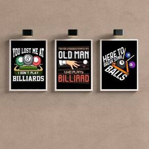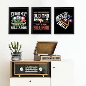Kit 3 quadros decorativos bilhar sinuca 24x18cm - com vidro Moldura: madeira branca Informações do produto tire todas as suas dúvidas no descritivo abaixo: decoração para quarto, sala, cozinha, escritório, área gourmet e muito mais. Chega de paredes vazias medidas - cada peça tem 24x18cm a5 . Material do papel - papel fotográfico brilhante de altíssima resolução acabamento - todos os quadros são acompanhados de vidro para proteção da imagem. - moldura em madeira maciça na cor preta ou branca conforme produto escolhido e pendurador . - os quadros são embalados de forma segura com plástico bolha com camada dupla de acordo com o tamanho dos quadros. Garantia - garantia de 3 meses. Meu quadro chegou. Como posso fixá-lo Você precisa apenas de um martelo e um prego, pois os quadros já vão acompanhados de penduradores. Esta é a forma mais indicada. Como posso limpar meu quadro A limpeza é feita como um móvel comum da sua casa. Apenas um pano seco ou espanador são suficientes para tal Ean: 7898550844020