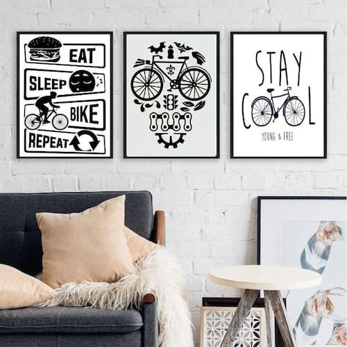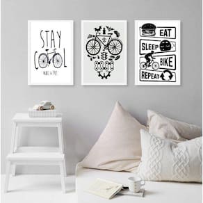 Kit 3 quadros decorativos cantinho da bicicleta 33x24cm Moldura: madeira preta Informações do produto tire todas as suas dúvidas no descritivo abaixo: decoração para quarto, sala, cozinha, escritório, área gourmet e muito mais. Chega de paredes vazias medidas - cada peça tem 33x24cm a4 . Material do papel - papel fotográfico brilhante de altíssima resolução acabamento - todos os quadros são acompanhados de uma película de acetato para proteção da imagem. - os quadros são embalados de forma segura com plástico bolha com camada dupla de acordo com o tamanho dos quadros. Garantia - garantia de 3 meses. Meu quadro chegou. Como posso fixá-lo Você precisa apenas de um martelo e um prego, pois os quadros já vão acompanhados de penduradores. Esta é a forma mais indicada. Caso prefira, você pode utilizar uma fita dupla face neste caso, sugerimos de alta qualidade para evitar que descole e seu quadro caia . Como posso limpar meu quadro A limpeza é feita como um móvel comum da sua casa. Apenas um pano seco ou espanador são suficientes para tal