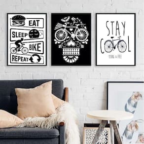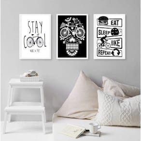 Kit 3 quadros decorativos cantinho da bike 45x34cm Moldura: madeira branca Informações do produto tire todas as suas dúvidas no descritivo abaixo: decoração para quarto, sala, cozinha, escritório, área gourmet e muito mais. Chega de paredes vazias. Medidas - cada peça tem 45x34cm a3 . Material do papel - papel fotográfico brilhante de altíssima resolução acabamento - todos os quadros são acompanhados de uma película de acetato para proteção da imagem. - os quadros são embalados de forma segura com plástico bolha com camada dupla de acordo com o tamanho dos quadros. Garantia - garantia de 3 meses. Meu quadro chegou. Como posso fixá-lo Você precisa apenas de um martelo e um prego, pois os quadros já vão acompanhados de penduradores. Esta é a forma mais indicada. Caso prefira, você pode utilizar uma fita dupla face neste caso, sugerimos de alta qualidade para evitar que descole e seu quadro caia . Como posso limpar meu quadro A limpeza é feita como um móvel comum da sua casa. Apenas um pano seco ou espanador são suficientes para tal