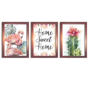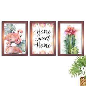 Kit 3 Quadros Decorativos com Moldura Rose Home Flamingo Quadros decorativos fabricados com moldura de madeira de reflorestamento com acabamento laqueado, impressão a laser em papel couché 300g, fundo em madeira. As paredes ganham cor e vida com quadros e painéis decorativos. Escolha os modelos que faltam para deixar sua decoração ainda mais bonita. Na sala, no quarto ou em outros cômodos, as peças coloridas ou em preto e branco garantem mais estilo.