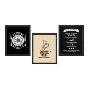 Nossos quadros são confeccionados em excelente qualidade, para que você decore sua casa ou comércio com bom gosto e economizando. Com esse kit de quadros decorativos com temática de café/comida, seu ambiente ou cozinha ficará mais aconchegante. Também é uma ótima opção para presentear alguém especial. Especificações do produto: O valor do anúncio refere-se ao kit com 3 três quadros. As estampas são as da imagem. Tamanho de cada quadro: 29,5 cm de comprimento x 24,5 cm altura x 3 cm de bordas x 1 cm de espessura. Área de impressão: 20x25cm. Todos os quadros possuem vidro e impressão a laser em papel gloss. Moldura: Preta com banho fosco. Você recebe o quadro pronto, com pendurador para colocar na parede. Marca: Minas Pedras E Presentes