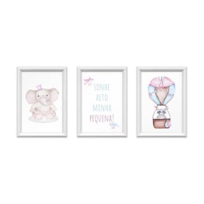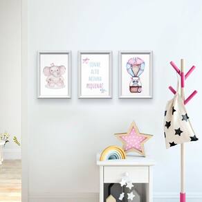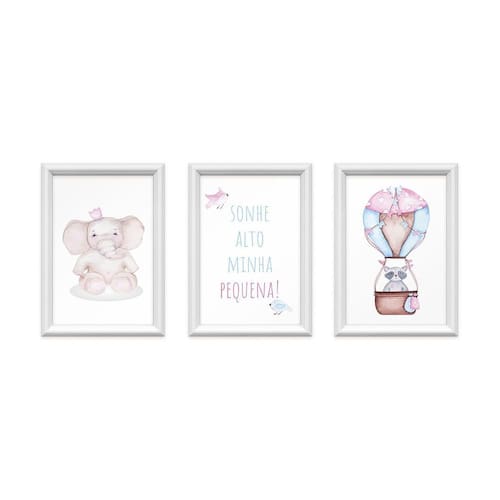 Kit 3 Quadros Decorativos Elefante Balão Rosa 24x34cm Características Gerais do Produto: Benefícios do produto: Fabricados com materiais de alta qualidade, não desbotam, alem de fácil instalação.. Dimensões AxLxP CM : 34 X 24 X 1,2 Cada peça Formato: Retangular Produzido em: MDF, EVA e Impressão vinílica em altíssima definição Cor acabamento: Colorido : Este produto possui junto ao fabricante contra defeitos de fabricação Aplicação: Parede Acompanha o produto: 03 Quadros 03 Kit instalação : Este produto possui contra defeitos de fabricação Marca: Não Informado