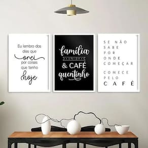 Kit 3 quadros decorativos família e café 33x24cm Cor: moldura preta Informações do produto tire todas as suas dúvidas no descritivo abaixo: decoração para quarto, sala, cozinha, escritório, área gourmet e muito mais. Chega de paredes vazias medidas - cada peça tem 33x24cm a4 . Material do papel - papel fotográfico brilhante de altíssima resolução acabamento - todos os quadros são acompanhados de uma película de acetato para proteção da imagem. - os quadros são embalados de forma segura com plástico bolha com camada dupla de acordo com o tamanho dos quadros. Garantia - garantia de 3 meses. Meu quadro chegou. Como posso fixá-lo Você precisa apenas de um martelo e um prego, pois os quadros já vão acompanhados de penduradores. Esta é a forma mais indicada. Caso prefira, você pode utilizar uma fita dupla face neste caso, sugerimos de alta qualidade para evitar que descole e seu quadro caia . Como posso limpar meu quadro A limpeza é feita como um móvel comum da sua casa. Apenas um pano seco ou espanador são suficientes para tal