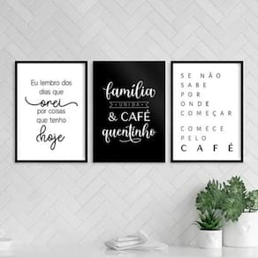 Kit 3 quadros decorativos família e café 45x34cm Cor: moldura branca Informações do produto tire todas as suas dúvidas no descritivo abaixo: decoração para quarto, sala, cozinha, escritório, área gourmet e muito mais. Chega de paredes vazias. Medidas - cada peça tem 45x34cm a3 . Material do papel - papel fotográfico brilhante de altíssima resolução acabamento - todos os quadros são acompanhados de uma película de acetato para proteção da imagem. - os quadros são embalados de forma segura com plástico bolha com camada dupla de acordo com o tamanho dos quadros. Garantia - garantia de 3 meses. Meu quadro chegou. Como posso fixá-lo Você precisa apenas de um martelo e um prego, pois os quadros já vão acompanhados de penduradores. Esta é a forma mais indicada. Caso prefira, você pode utilizar uma fita dupla face neste caso, sugerimos de alta qualidade para evitar que descole e seu quadro caia . Como posso limpar meu quadro A limpeza é feita como um móvel comum da sua casa. Apenas um pano seco ou espanador são suficientes para tal