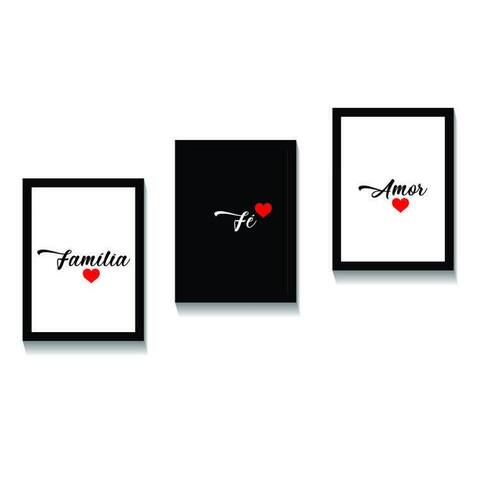 Kit 3 Quadros Decorativos Família Fe Amor PB A4 Material: - Kit 3 quadros no tamanho 24x33cm - Moldura madeira maciça de reflorestamento pinnus com cor preto e branco fosco. Acompanha vidro cristal transparente. Arte revelada em alta qualidade e papel profissional superfície fosca Fundo em HDF High Density Fiberboard o melhor do mercado. Pendurador móvel bem fácil para fixar na parede.